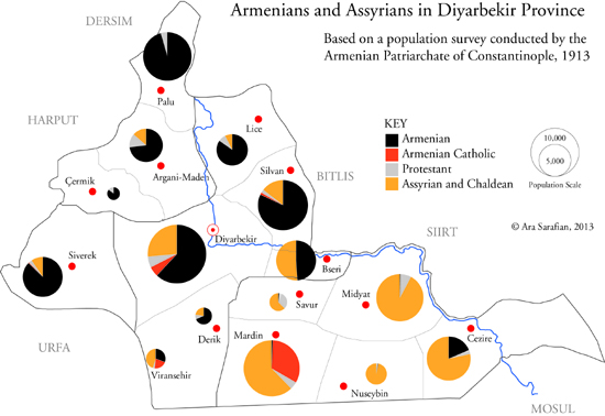 2. Around 80,000 Armenians lived in Diyarbekir vilayet, which was predominantly Kurdish. There were also sizeable Assyrian and Chaldean communities in the province. Armenians lived mainly in the north of the vilayet, with a major concentration in the city of Diyarbekir. They were successful merchants, artisans and industrialists. [Map of Vilayet with Christian populations]