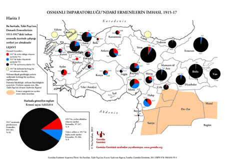 If one look at the fate of Armenian clergymen as a control group, one can see that well over 90% were killed during 1915-18. In the case of Diyarbekir province, of 122 named Armenian clergymen 115 were reportedly killed in the Genocide and two died of natural causes. [Show data] Similarly, Minister of Interior Talaat Pasha’s own report on Armenians, based on a survey he ordered in 1917, of 1.6 million Ottoman Armenians (according to official figures for 1914), 1.2 million were missing in 1917, and a further 200,000 survived outside of their native provinces. In the case of Diyarbekir province, of 56,166 Armenians in the province (according to official figures for 1914 – unadjusted figures), practically none remained in Diyarbekir in 1917, while 1,849 were counted in other provinces. The main concentrations were Aleppo 796, Syria 598, Beyrout 177 and Adana 144. That means that, in Talaat’s view, 97% of Armenians in Diyarbekir province had disappeared by the middle of 1917. [Map Illustrating Talaat’s Data]